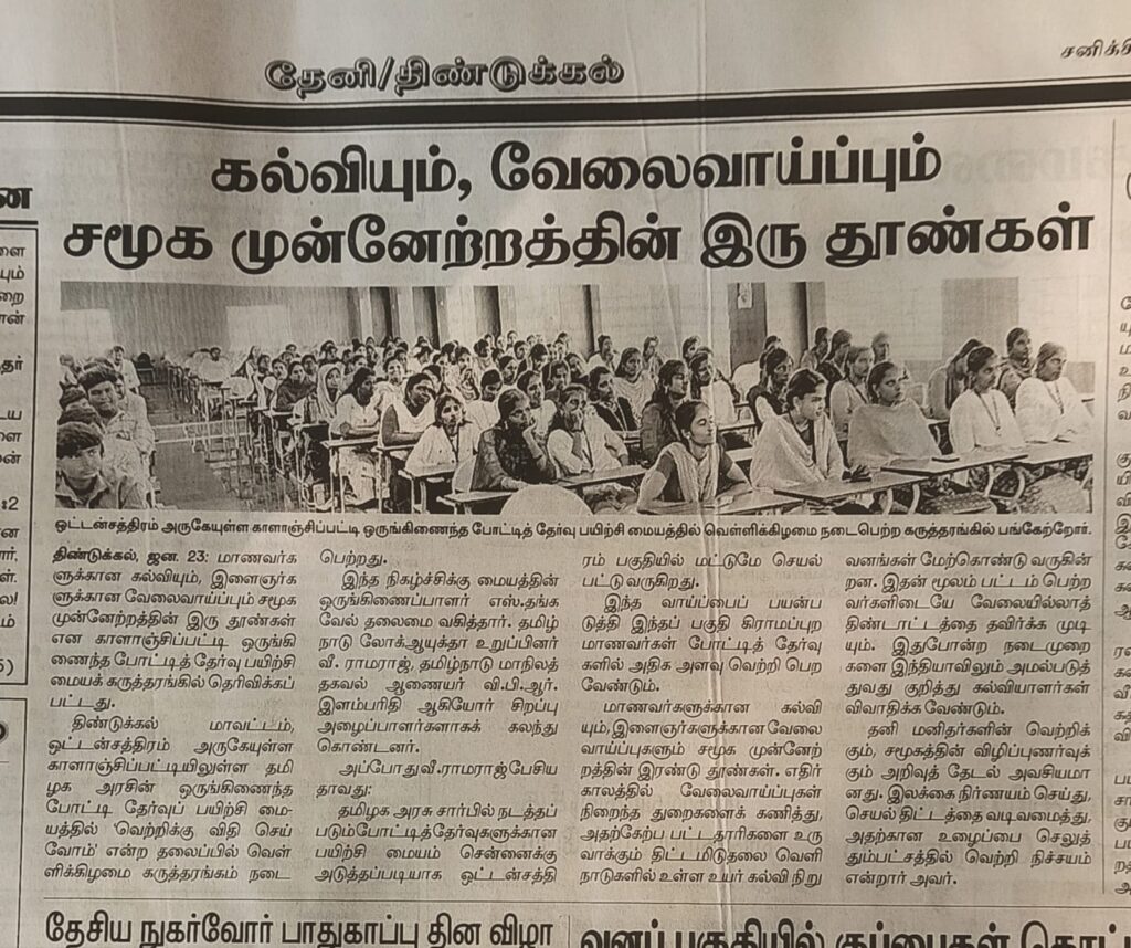 The training centres for competitive examinations conducted by the Tamil Nadu Government’s training department are located only in Chennai and Oddanchatram. Dr. V. Ramaraj urged the rural students in the Oddanchatram area to utilize this opportunity, join this centre, receive training, and succeed in competitive examinations.