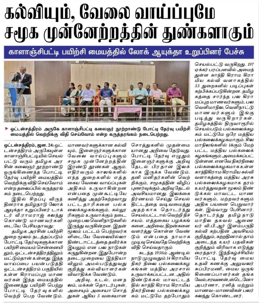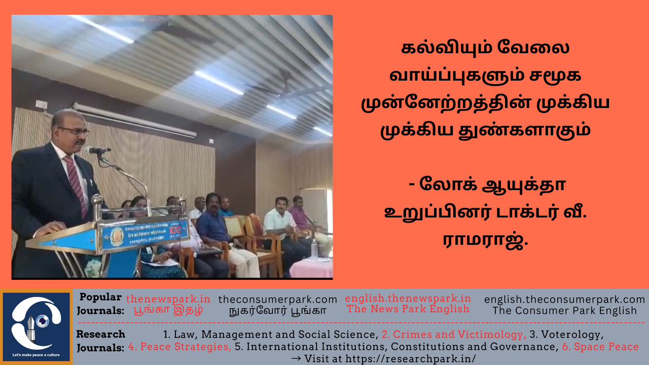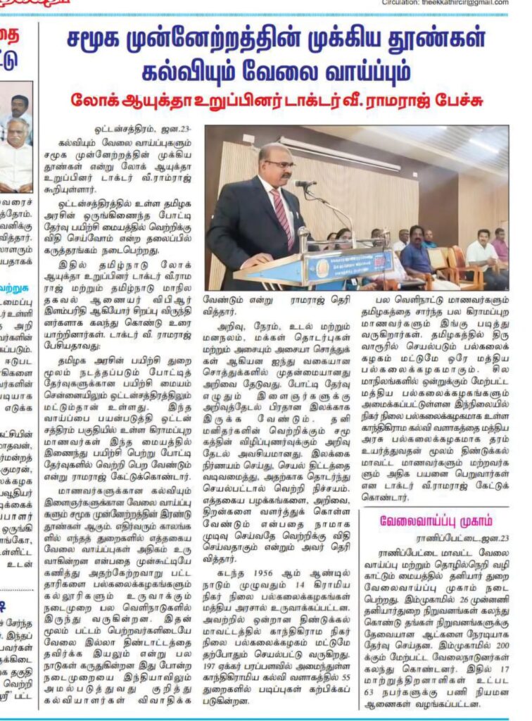 கல்வியும் வேலை வாய்ப்புகளும் சமூக முன்னேற்றத்தின் முக்கிய முக்கிய துண்களாகும் – லோக் ஆயுக்தா உறுப்பினர் டாக்டர் வீ. ராமராஜ்.