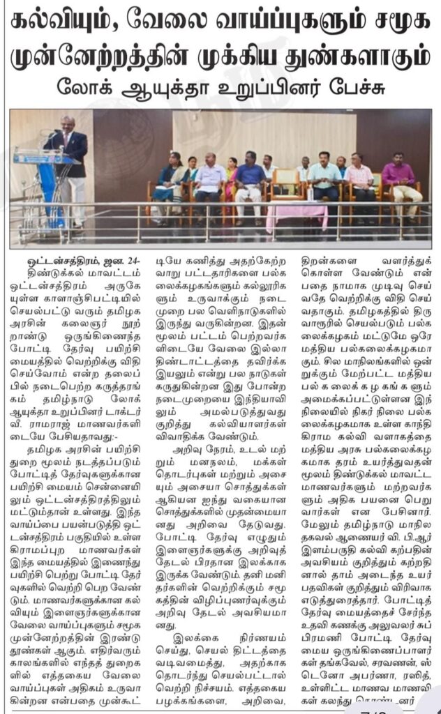 A seminar titled “Let’s Create the Path to Success” was held at the Tamil Nadu Government’s Integrated Competitive Examination Training Centre in Oddanchatram. Tamil Nadu Lokayukta member Dr. V. Ramaraj and Tamil Nadu State Information Commissioner V.P.R. Ilambarithi participated as special guests and delivered speeches.