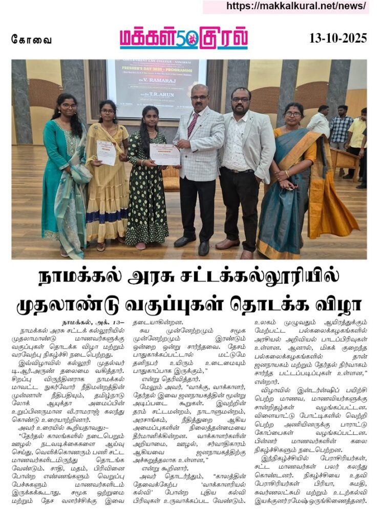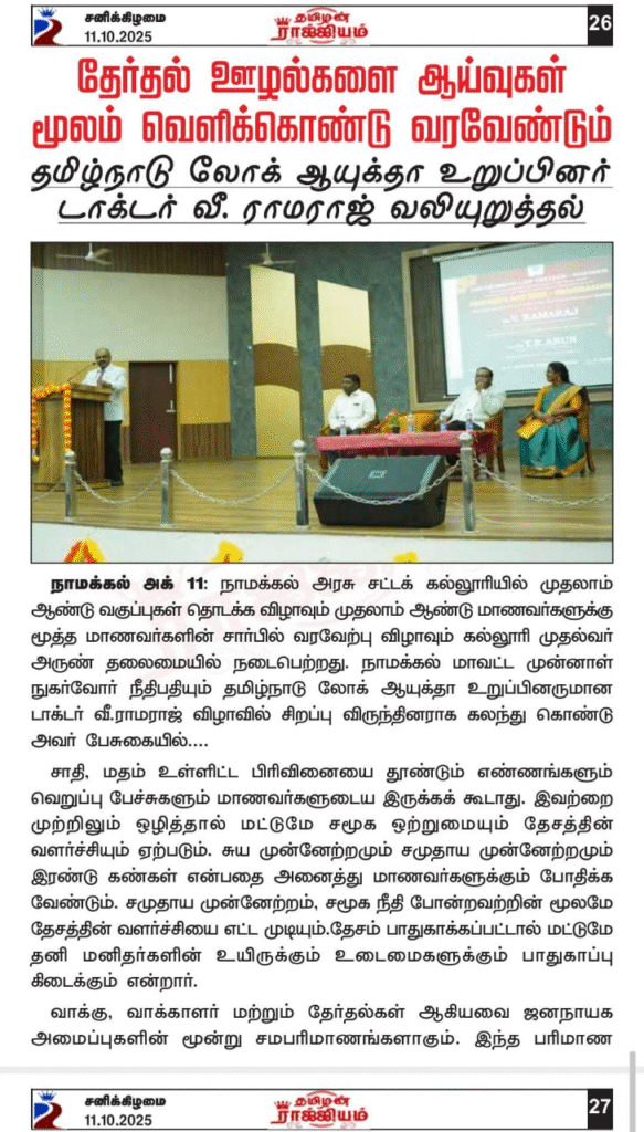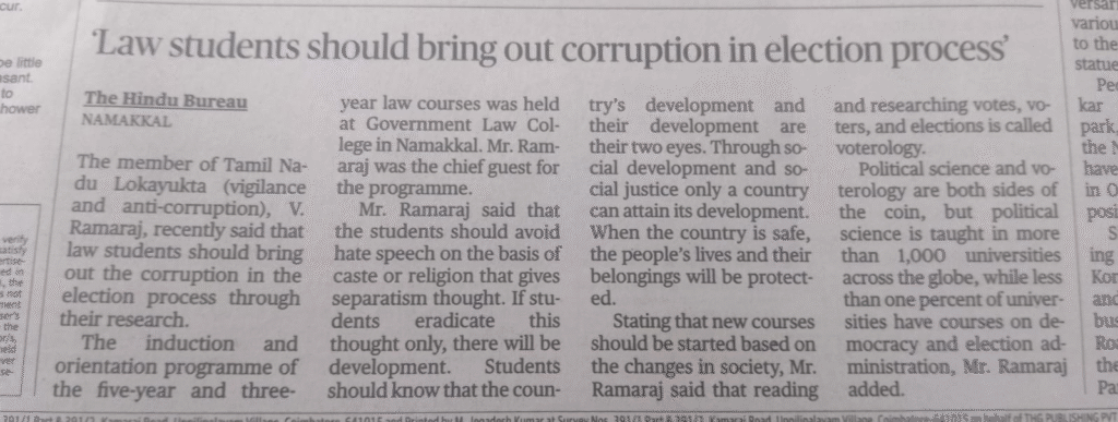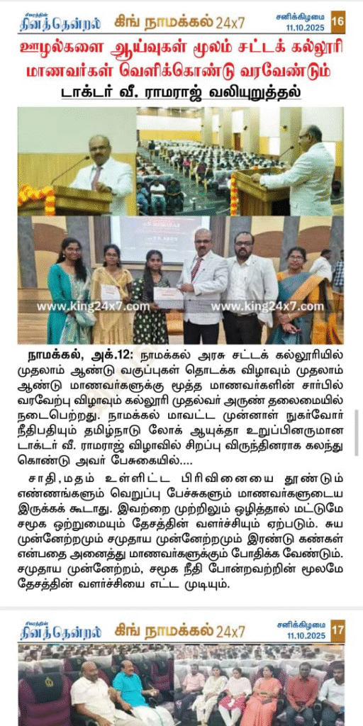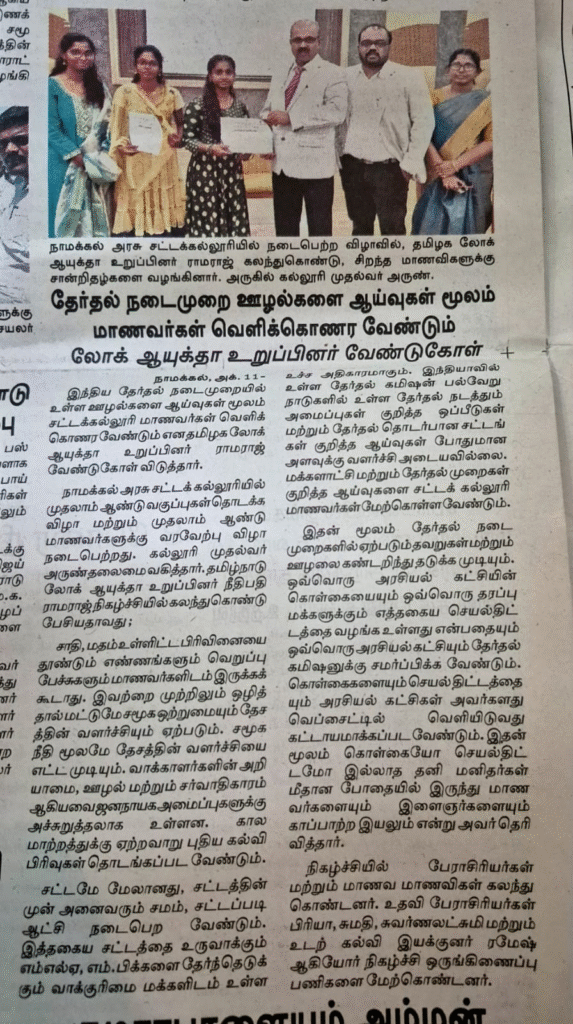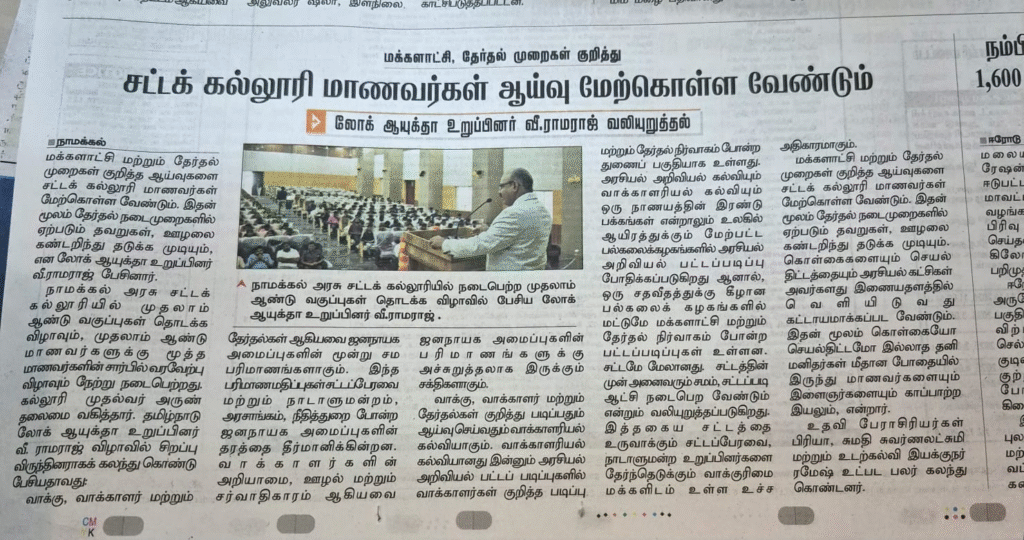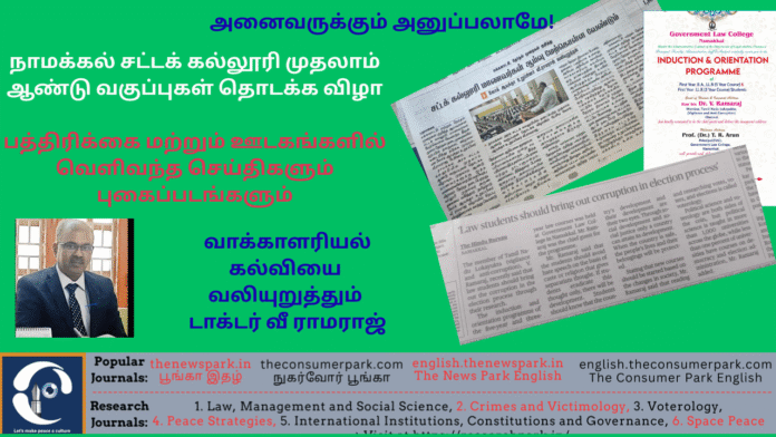 நாமக்கல் சட்டக் கல்லூரி முதலாம் ஆண்டு வகுப்புகள் தொடக்க விழா. பத்திரிக்கை மற்றும் ஊடகங்களில் வெளிவந்த செய்திகளும் புகைப்படங்களும். வாக்காளரியல் கல்வியை வலியுறுத்தும் டாக்டர் வீ. ராமராஜ்