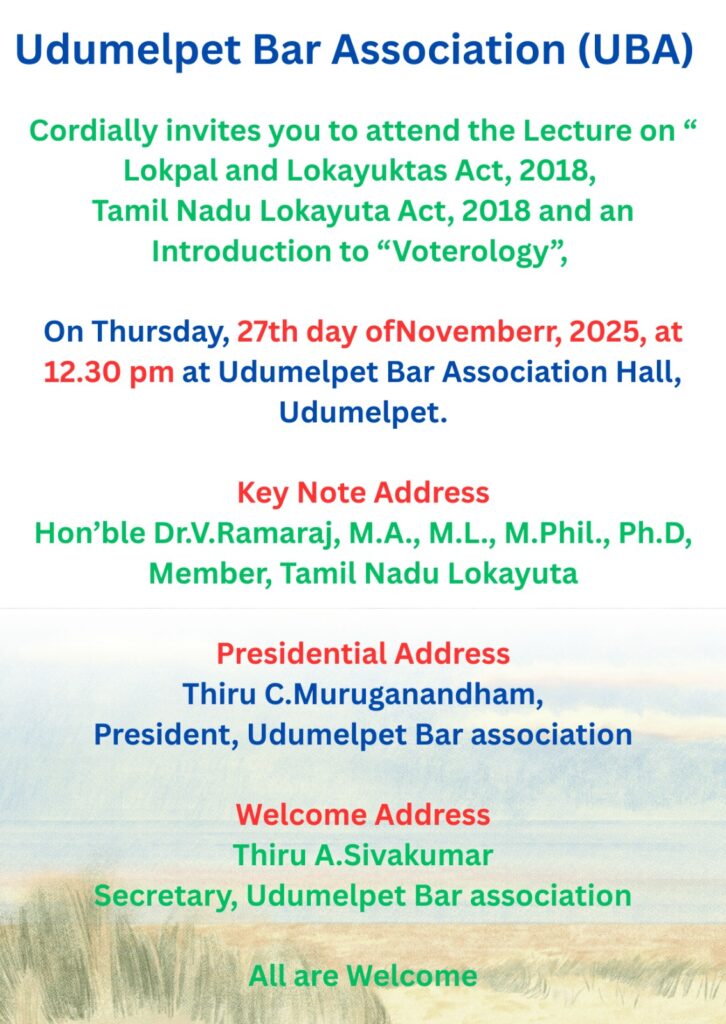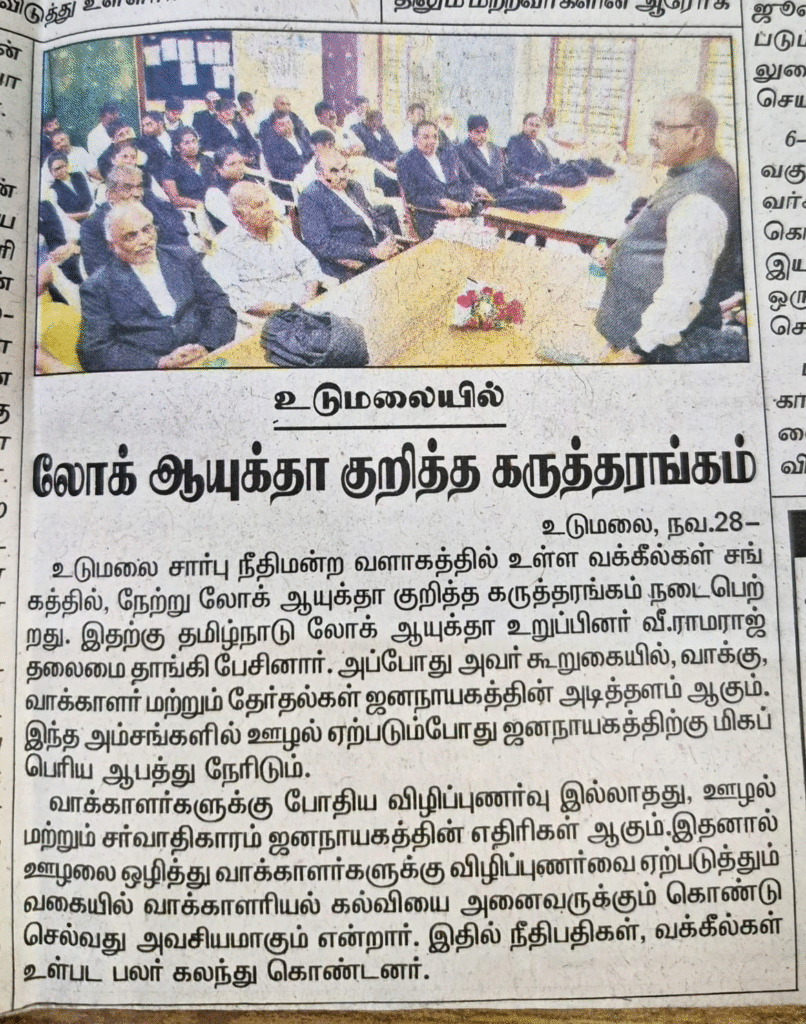 உடுமலைப்பேட்டை வழக்கறிஞர்கள் சங்கத்தின் சார்பில் உடுமலைப்பேட்டை வழக்கறிஞர்கள் சங்கத்தின் தலைவர் திரு சி. முருகானந்தம் தலைமையில் லோக்பால் மற்றும் லோக் ஆயுக்தா குறித்த கருத்தரங்கு நடைபெற்றது. இதில் தமிழ்நாடு லோக் ஆயுக்தா உறுப்பினர் டாக்டர் வீ. ராமராஜ் சிறப்பு விருந்தினராக கலந்து கொண்டு பேசியதாவது.