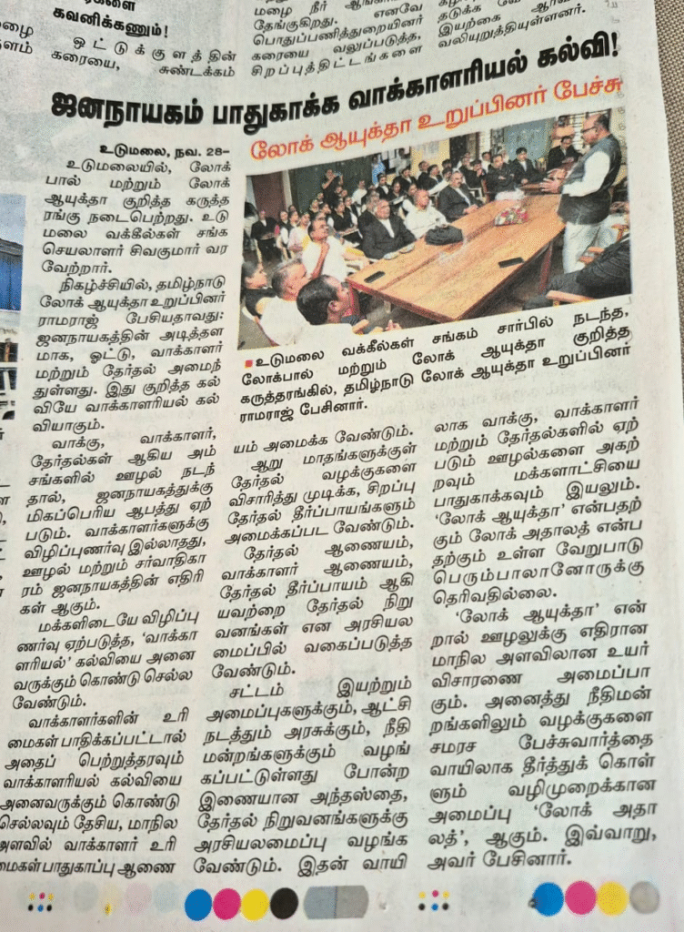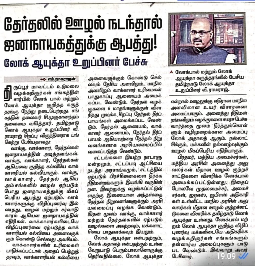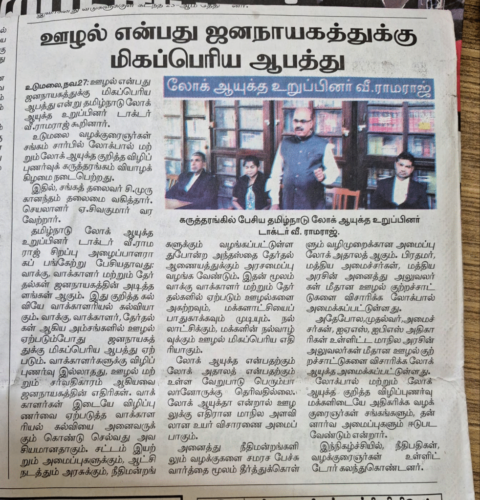 நல்லாட்சிக்கும் மக்களின் நல்வாழ்விற்கு ஊழல் மிகப்பெரிய எதிரியாகும். பிரதமர், மத்திய அமைச்சர்கள், மத்திய அரசின் அனைத்து அலுவலர்கள்  மீதான ஊழல் குற்றச்சாட்டுகளை விசாரிக்க லோக்பால் அமைக்கப்பட்டுள்ளது.  இதைப்போலவே முதலமைச்சர், அமைச்சர்கள், ஐஏஎஸ், ஐபிஎஸ் அதிகாரிகள் உள்ளிட்ட மாநில அரசின் அலுவலர்கள் மீதான  ஊழல் குற்றச்சாட்டுகளை விசாரிக்க தமிழ்நாடு லோக் ஆயுக்தா அமைக்கப்பட்டுள்ளது. லோக்பால் மற்றும் லோக் ஆயுக்தா குறித்த விழிப்புணர்வு மக்களிடையே அதிகரிக்க வழக்கறிஞர்கள் சங்கங்களும் தன்னார்வ அமைப்புகளும் பாடுபட வேண்டும் என்று வீ. ராமராஜ் வலியுறுத்தினார்.