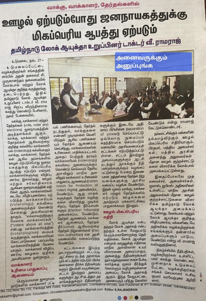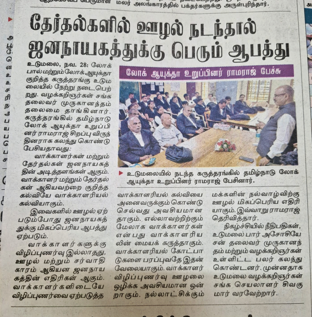வாக்கு, வாக்காளர், தேர்தல்கள் ஆகிய அம்சங்களில் ஊழல் ஏற்படும்போது ஜனநாயகத்துக்கு மிகப்பெரிய ஆபத்து ஏற்படும் –  தமிழ்நாடு லோக் ஆயுக்தா உறுப்பினர் டாக்டர் வீ. ராமராஜ்