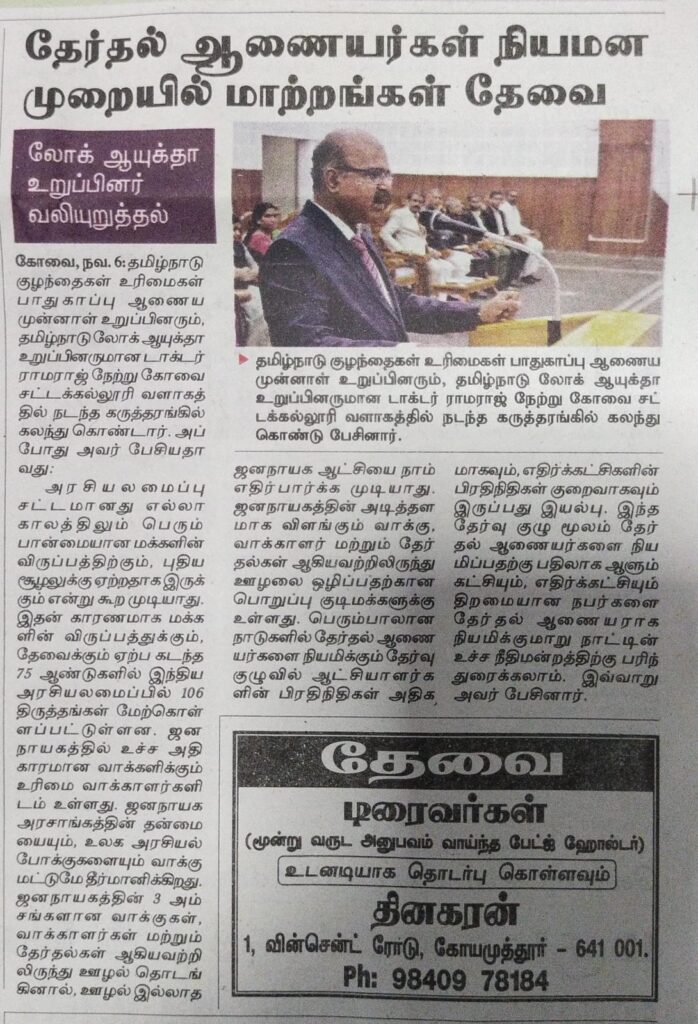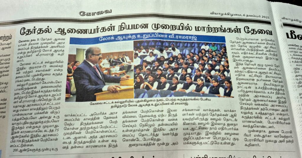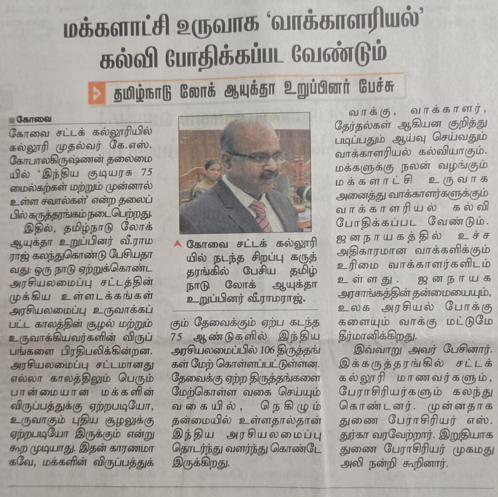 கோவை சட்டக் கல்லூரியில் கல்லூரி முதல்வர் கே. எஸ். கோபாலகிருஷ்ணன் தலைமையில் “இந்திய குடியரசு @75 – மைல்கற்கள் மற்றும் முன்னால் உள்ள சவால்கள்” என்ற தலைப்பில் கருத்தரங்கம் நடைபெற்றது இதில் தமிழ்நாடு லோக் ஆயுக்தா உறுப்பினர் டாக்டர் வீ. ராமராஜ் கலந்துகொண்டு பேசியதாவது.